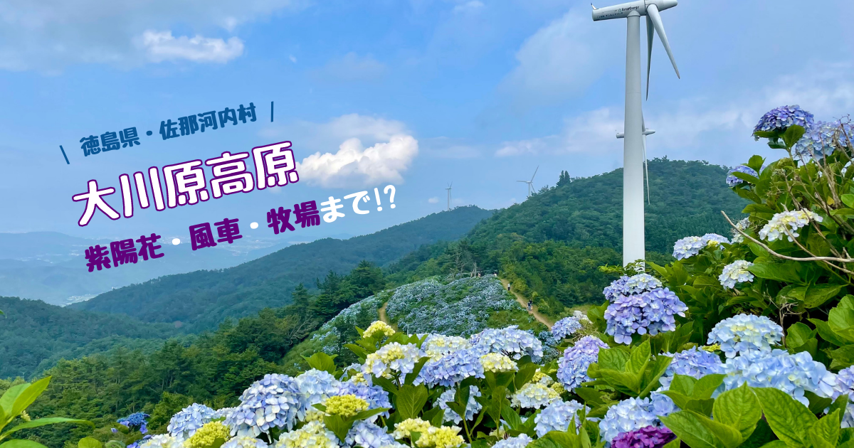 大川原高原とは、徳島県の名東郡佐那河内村にあり、村営の牧場や風車などがある高原!4月下旬〜5月中旬にはツツジ、7月上旬〜7月下旬には紫陽花が見頃を迎えます。