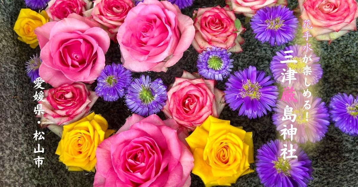 愛媛県松山市内で花手水スポットをお探しの方必見!松山市内からもアクセス楽々、おしゃれスポットとしても近年注目されている三津近辺の【嚴島神社(厳島神社)いつくしまじんじゃ】では、花手水や可愛い御朱印が楽しめちゃいます。